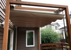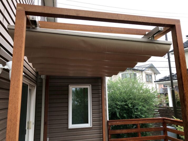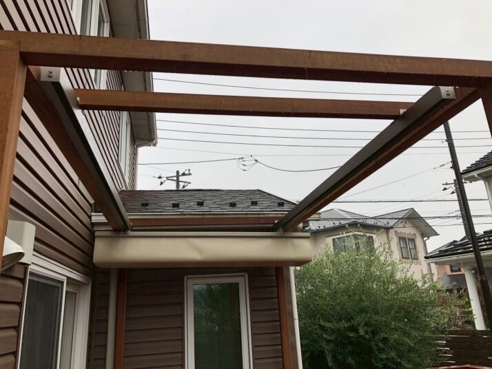 雨を防げるオーニングのご要望を頂きましたが、既存の室外機用ホースや小窓の配置関係により、難しい施工となりました。